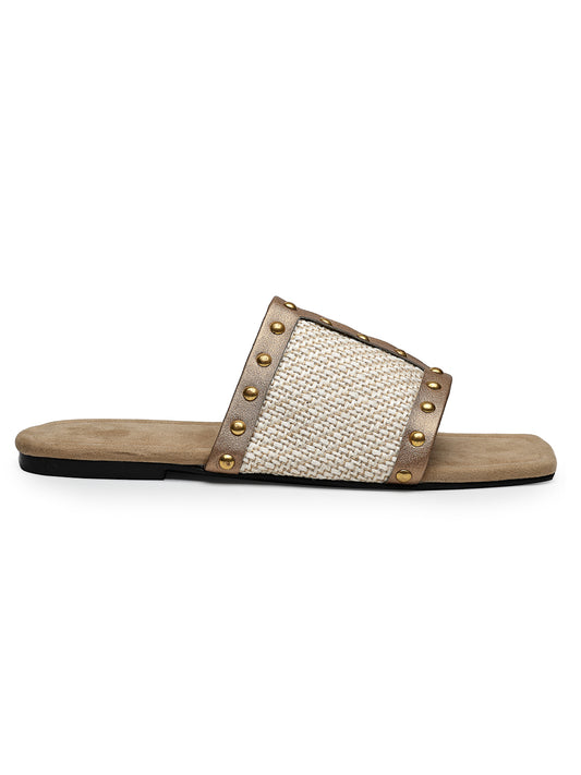 Aureva - Square Toe Slip-On Woven Charm Buckle Flats (Tan & Beige)