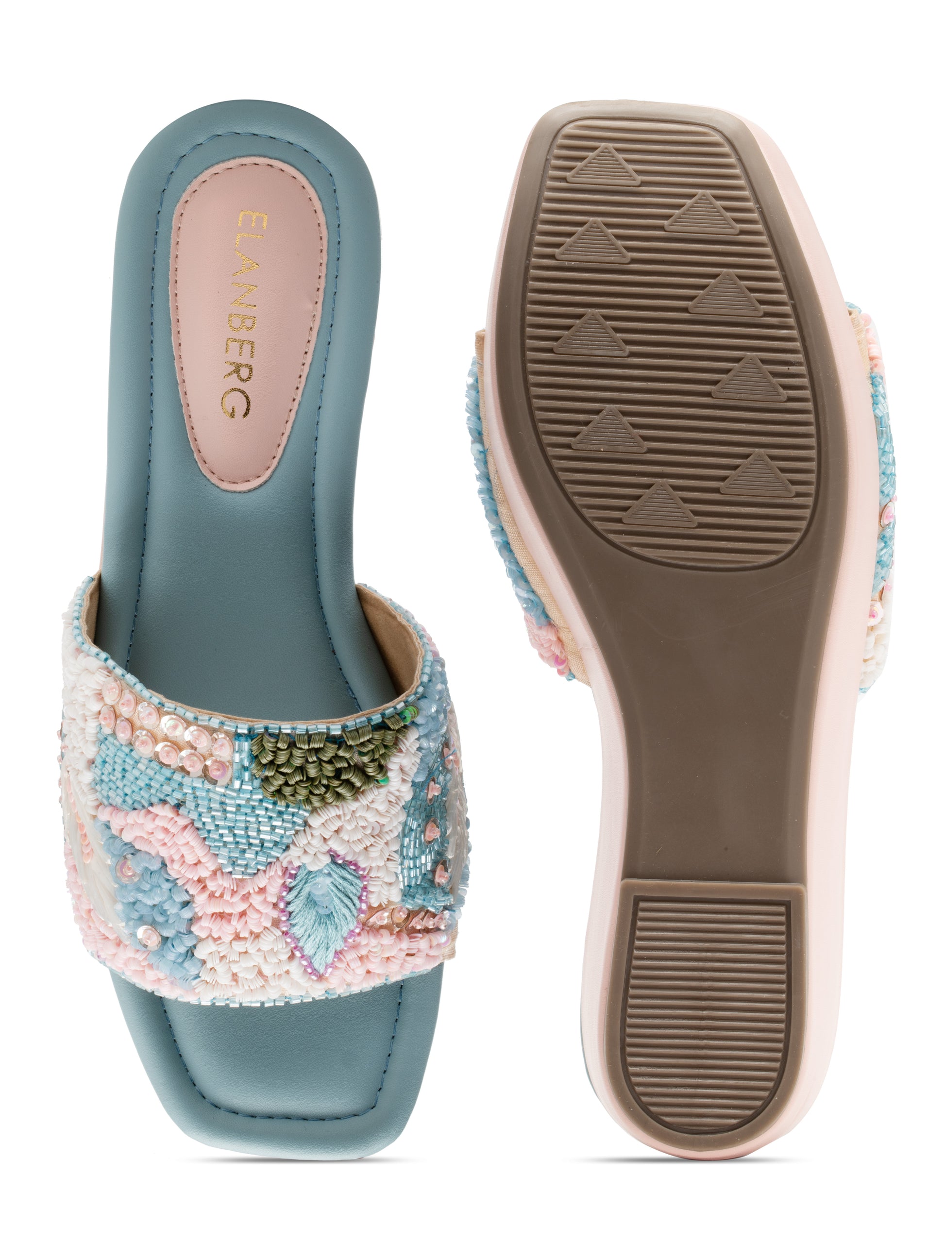 Add a touch of handcrafted luxury to your wardrobe with Aurelia, a wedgeHeel featuring a pastel embroidered strap with bead and sequin detailing. The pink cushioned insole ensures comfort, while the powder-blue wedge heel adds height with stability. Perfect for festive occasions, chic evenings, or even statement day looks, Aurelia blends artistry and comfort effortlessly.
