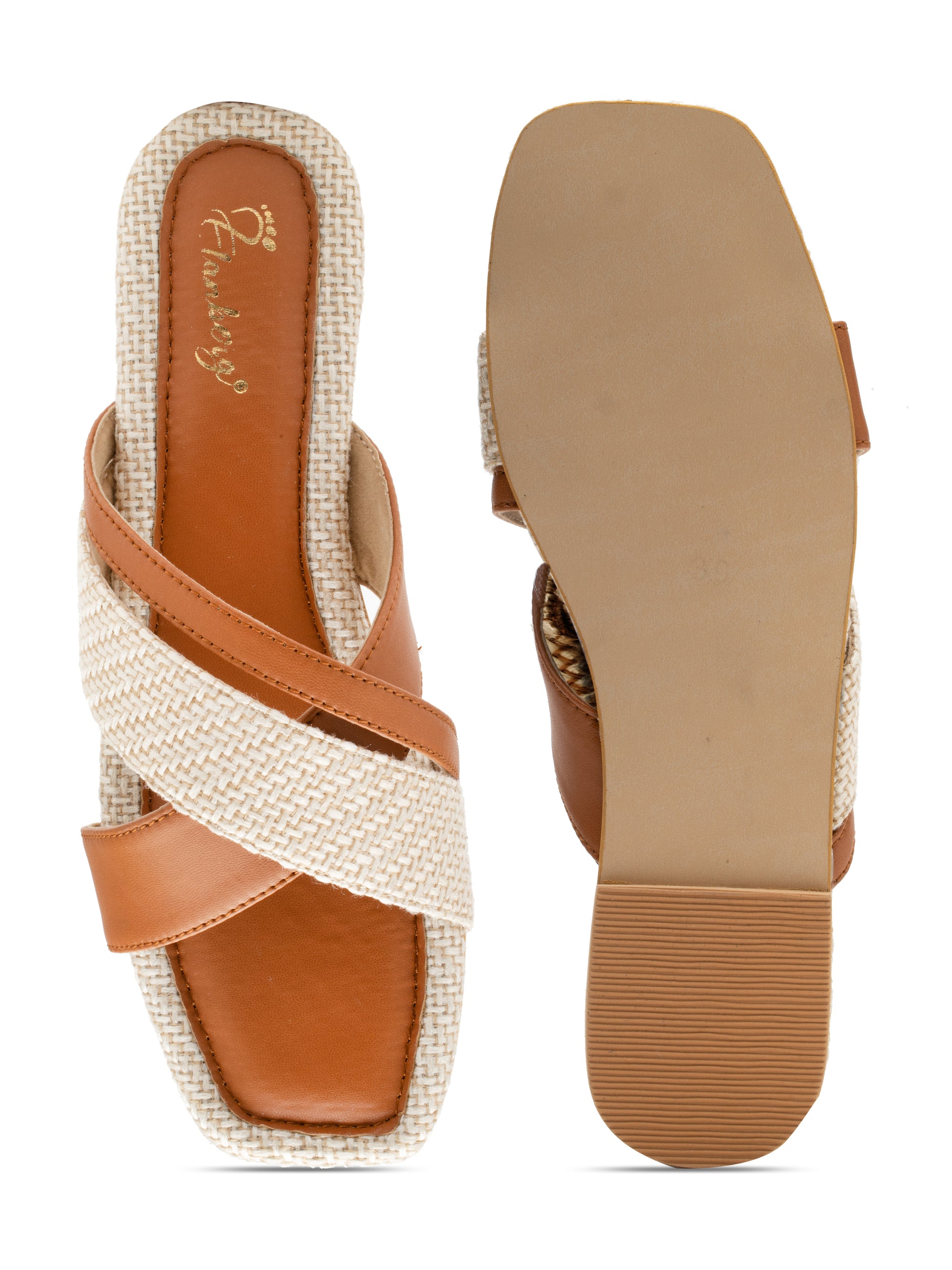 Step into effortless style with these chic flat slides featuring a unique criss-cross strap design. Crafted with a combination of textured woven fabric and smooth tan faux leather, these flats bring together a rustic yet modern vibe. The square toe design and cushioned insole ensure all-day comfort, while the flat sole makes them perfect for everyday wear.